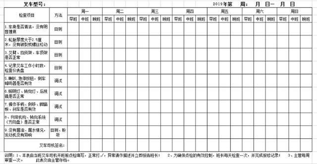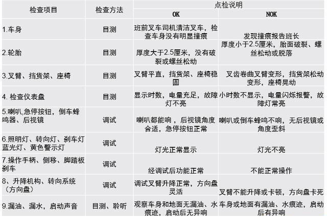 叉車(chē)的點(diǎn)檢內(nèi)容和檢查方法,如下表有詳細(xì)的分解。