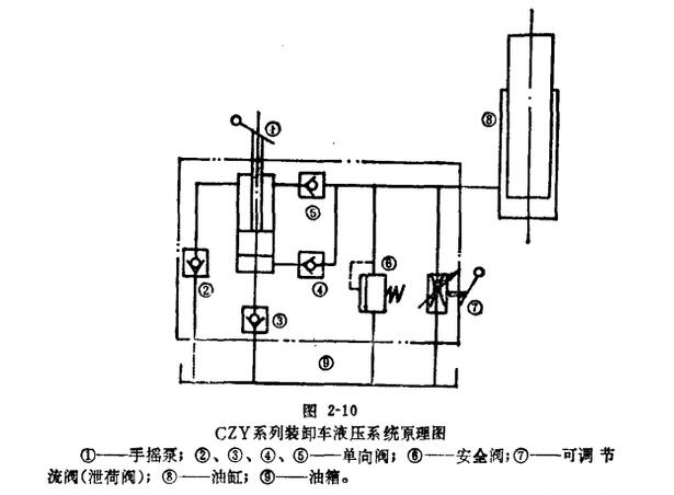 將手搖泵的手柄上提,把油和油箱經(jīng)過(guò)單向閥吸入油泵下腔,油泵上腔的壓力油則經(jīng)過(guò)單向閥打入油缸,迫使活塞升起而帶同貨叉起升;