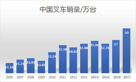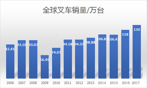 2016年中國(guó)宏觀經(jīng)濟(jì)復(fù)蘇,工程機(jī)械開(kāi)始復(fù)蘇,經(jīng)濟(jì)回暖,叉車(chē)行業(yè)也突破32萬(wàn)臺(tái)的平臺(tái),而實(shí)現(xiàn)37萬(wàn)臺(tái)的歷史新高。而2017年,隨著工程機(jī)械,制造業(yè)的復(fù)蘇,叉車(chē)銷(xiāo)量在2017年上半年達(dá)到23.8萬(wàn)臺(tái)的規(guī)模,全年極有可能實(shí)現(xiàn)50萬(wàn)臺(tái)的規(guī)模。而全球叉車(chē)銷(xiāo)量也達(dá)到130萬(wàn)臺(tái)的規(guī)模。