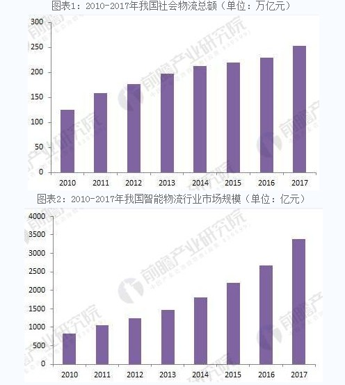 物流總額近十年來持續(xù)增長,2017年物流總額達到252.8萬億元,自2010年起復合增長率為10.53%。隨著國內自動化信息技術水平的不斷提升,國內智能物流系統(tǒng)行業(yè)也出現(xiàn)了快速發(fā)展。根據相關協(xié)會的數(shù)據,智能物流市場規(guī)模從2010年的不足800億元級別迅速增長至2016年的2669億元,至2017年已經達到3380億。