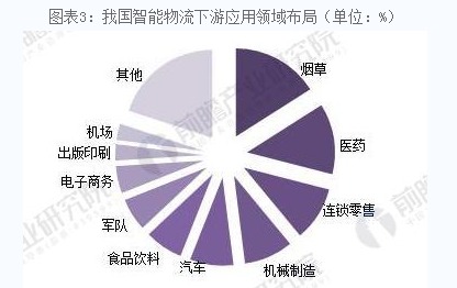 智能物流下游需求較為廣泛。目前,在已建成的智能物流系統(tǒng)中,煙草領域占16%,醫(yī)藥占13%,連鎖零售占10%,機械制造占9%,汽車占8%,食品飲料行業(yè)占7%,軍隊占6%,電子商務占5%,出版印刷占3%,機場占3%,其他占20%。