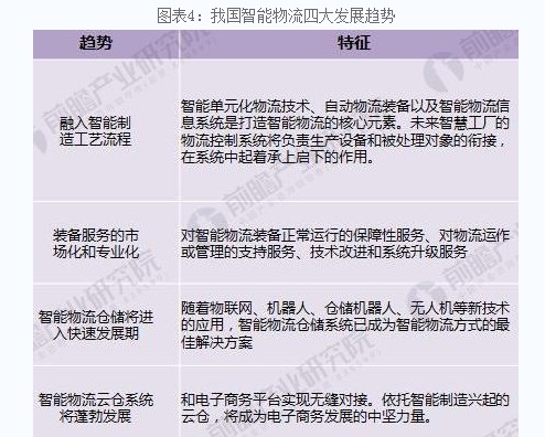我國智能物流將迎來四大主要發(fā)展趨勢:融入智能制造工藝流程、市場化與專業(yè)化、倉儲快速發(fā)展、云倉系統(tǒng)興起。