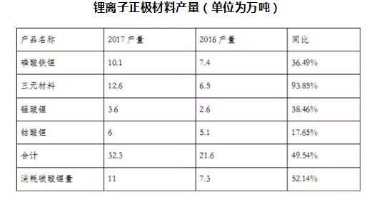 根據(jù)中國有色金屬工業(yè)協(xié)會(huì)鋰業(yè)分會(huì)統(tǒng)計(jì),2017年我國鋰離子電池正極材料產(chǎn)量32.3萬噸,同比增長49.54%,消耗碳酸鋰約11萬噸,同比增長52.14%。十多家企業(yè)正極材料的產(chǎn)量超過1萬噸。