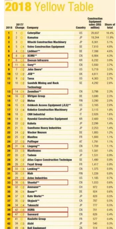 2018年全球工程機械制造商50強排行榜,12家中國企業(yè)上榜,分別是徐工、三一、中聯(lián)重科、柳工、鐵建重工、龍工、山推、國機重工、廈工、山河智能、雷沃重工、北方股份等。山推,在全球工程機械制造商50強中排名第38位。