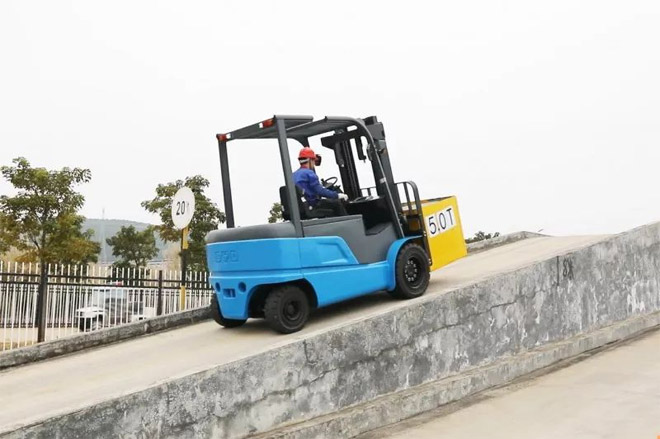 ▲ 比亞迪5噸電動(dòng)平衡重叉車爬坡