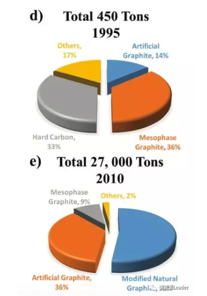 風水輪流轉,由于硬碳材料存在的種種問題,因此人們又開始重新審視石墨材料作為負極材料的可能性,早期石墨材料在PC溶劑中無法形成穩(wěn)定的SEI膜,以及PC共嵌入的問題阻礙了石墨材料的應用,但是人們通過在電解液中加入EC溶劑,在石墨表面形成了穩(wěn)定的SEI膜,并避免了PC共嵌入的問題,因此在90年代中期以后,鋰離子電池市場又開始逐漸轉向石墨材料,并且隨著石墨材料性能的不斷提升,其市場占有率也逐年增加,硬碳材料逐漸被淘汰出局。在石墨材料性能提升的幫助下,鋰離子電池的性能也得到了大幅的提升,體積能量密度從1997年的350Wh/L,提高到了2011年的625Wh/L。