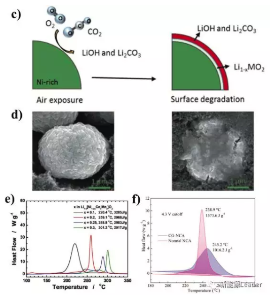 對高能量密度的追求催生了另外一種重要的正極材料,Ni基正極材料,LiNiO2(LNO)具有與LCO類似的層狀結構,但是容量能夠達到220mAh/g,遠高于LCO材料,Ni相比于Co低廉的價格也讓LNO材料在成本上更佳具有優(yōu)勢。但是LNO材料首次效率低,循環(huán)穩(wěn)定性差限制了其大規(guī)模的應用,研究表明Co、Al、Mn等元素的替代部分Ni元素能夠顯著提高LNO材料的穩(wěn)定性。因此我們現在看到的Ni基材料主要分為兩大類,一類是三元NCM材料,一類是NCA材料。憑借著高容量和良好的循環(huán)穩(wěn)定性,兩種材料在動力電池領域迅速得到了廣泛的應用,特別是在國內NCM材料更是成為了高比能電池的主流正極材料。Ni基材料的容量與其中Ni的含量具有密切的關系,因此近年來在不斷提高的動力電池能量密度的推動下,Ni基正極材料的Ni含量也在不斷提高,從最初的NCM111材料,提高到NCM532,NCM622,隨著動力電池能量密度向300Wh/kg邁進,NCM811材料的應用也已經日益普遍。
