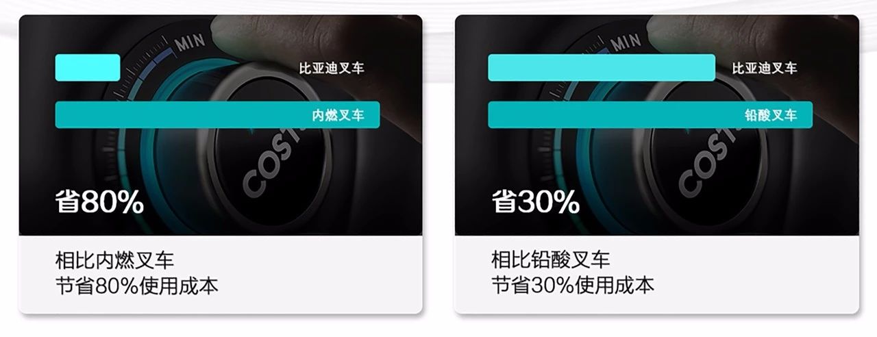 另經(jīng)實(shí)際統(tǒng)計分析,比亞迪叉車的綜合工況使用成本,相比內(nèi)燃叉車可節(jié)省達(dá)80%、相比鉛酸電池叉車可節(jié)省達(dá)30%,為客戶大大節(jié)省了物流搬運(yùn)成本,是一款真正意義上的綠色搬運(yùn)產(chǎn)品。