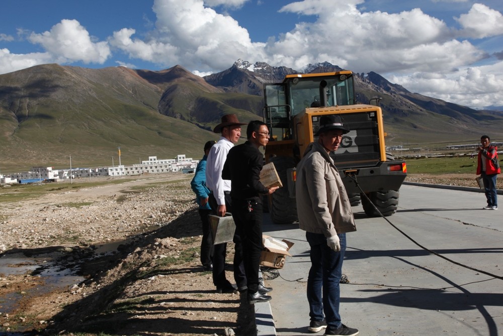今天剩余的試驗(yàn)中有一項(xiàng)最不確定性的就是牽引力測(cè)試,受場(chǎng)地地面摩擦力及負(fù)荷車限制,想測(cè)出理想的最大牽引力,誰(shuí)的心里都沒(méi)有底。做完三項(xiàng)和,鄭澤佳沿著崎嶇不平的道路將測(cè)試車開(kāi)到一個(gè)相對(duì)平直的水泥路面。牽引力測(cè)試準(zhǔn)備就緒,第一次開(kāi)測(cè):結(jié)果路面粉塵太多輪胎打滑,沒(méi)有結(jié)果。大家掃把掃,端水沖洗路面。第二次開(kāi)測(cè):負(fù)荷車被測(cè)試車拖著滑行了,還是沒(méi)有結(jié)果,從平板車上拿來(lái)枕木,加大負(fù)荷車輪胎墊塊數(shù)量。第三次開(kāi)測(cè):負(fù)荷車越過(guò)了枕木和墊塊,又是沒(méi)有結(jié)果。此時(shí)大家都已束手無(wú)策,邊上圍觀的人們說(shuō):你們廈工車太有力氣了!我們陪笑著說(shuō):就是??!第四次我們決定所有人都爬上負(fù)荷車增加負(fù)荷車重量做最后一搏。此時(shí)負(fù)荷車上站滿了人,貌似壯觀確屬無(wú)奈。第四次開(kāi)測(cè),終于不負(fù)眾望,有結(jié)果了。原本在公司里20分鐘能搞定的牽引力測(cè)試,我們花了足足兩個(gè)多小時(shí)。收拾工具、儀器,拆除傳感器,將測(cè)試車XG958N開(kāi)上平板車,天空又下起了冰雹,大家哆嗦著躲進(jìn)車?yán)?,啟程回拉薩,又是一個(gè)星夜兼程的夜晚。