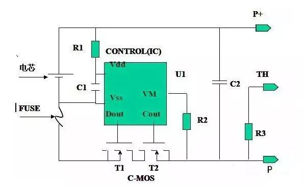 U1:控制IC;保護板所有功能都是IC通過監(jiān)視連接在VDD-VSS間的電壓差及VM-VSS間的電壓差而控制C-MOS執(zhí)行開關動作來實現(xiàn)的。