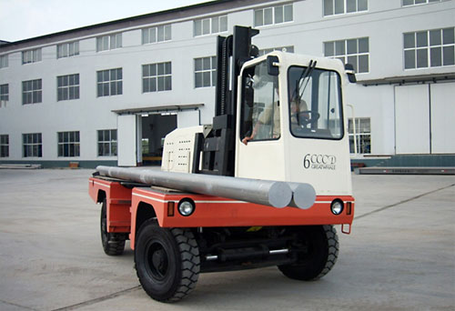 側(cè)面叉車是工業(yè)車輛的一種專用機型。滿足市場需要,在吸收國內(nèi)外同類產(chǎn)品優(yōu)點的基礎(chǔ)上,開發(fā)研制的新產(chǎn)品。它與一般平衡重式叉車的主要區(qū)別是工作裝置安裝在車身側(cè)面,除可以升降、傾斜外,還可以沿車身側(cè)向伸出和收進。適用于長型貨物的裝卸、堆垛和運輸。運輸時,貨物縱向放置在貨臺上,對通道寬度的要求較小,能充分有效地利用場地面積。