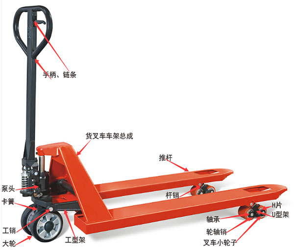 手動(dòng)液壓叉車主要結(jié)構(gòu)是由叉車小輪子(有PU、PV和聚氨酯三種輪子之分)、軸承、輪軸銷、H片、U型架、軸銷、卡簧、開口銷、推桿、桿銷、工型架、工銷、叉車大輪子(有PU和PV兩種輪子之分)、 鏈條、手柄總成、液壓泵頭總成、貨叉車架總成等等的配件結(jié)構(gòu)而成。具休如下圖: