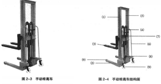 升降架:使貨叉在升降時上、下移動。 貨叉架:固定貨叉。 貨叉:插取托盤。 鏈條:升降貨叉。 保護欄:保護操作者及貨物。 U形扶手:控制行駛方向。 T形把手:起升貨叉。 腳踏把:起升貨叉。 車輪:前輪為載荷輪、后輪為轉向輪
