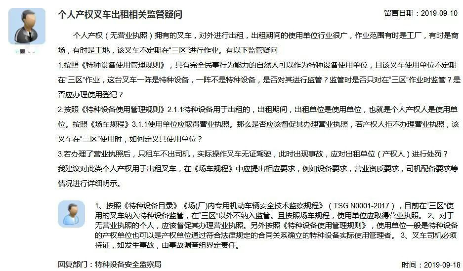 有網(wǎng)友在國家市場(chǎng)監(jiān)督管理總局網(wǎng)站公眾留言系統(tǒng)咨詢關(guān)于個(gè)人產(chǎn)權(quán)叉車出租如何監(jiān)管的問題,市場(chǎng)監(jiān)管總局特種設(shè)備安全監(jiān)察局給予了答復(fù)。