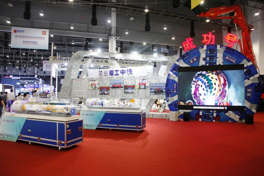 本次展會(huì),廈工中鐵攜三臺(tái)新型盾構(gòu)機(jī)模型精彩亮相,受到了境內(nèi)外客商的高度關(guān)注。廈工中鐵展廳以大理石色和藍(lán)色為主,運(yùn)用地鐵和盾構(gòu)機(jī)刀盤造型,整體布局威猛、陽剛、大氣,象征著廈工中鐵不斷向前、永續(xù)發(fā)展的美好前景。