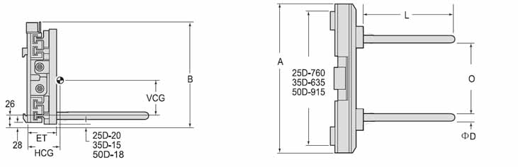 | Capacity 承載能力(kg) | Catalog Order NO 型號 | Mounting Class 安裝等級 | Load Center載荷中心(mm) | Bar Arm Length桿徑ΦD(mm) | Bar Arm Length桿長L(mm) | Opening Range張臂范圍O(mm) | Frame Width框架寬度A(mm) | Frame Height框架高度B(mm) | Vertical Center of Gravity垂直重心VCG(mm) | Weight 自重(kg) | Effective 失載距ET(mm) | Horizontal Center of Gravity 水平重心CGH(mm) |