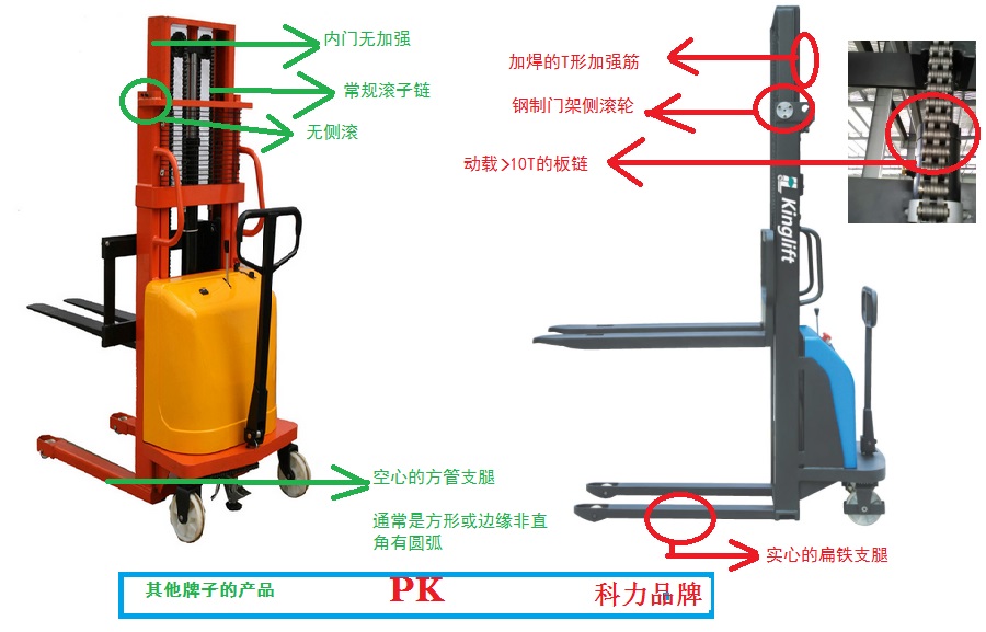 4、 科力半電動(dòng)堆高車支腿全部采用實(shí)心扁鐵,相對(duì)國(guó)內(nèi)其他廠的空心管強(qiáng)度更高